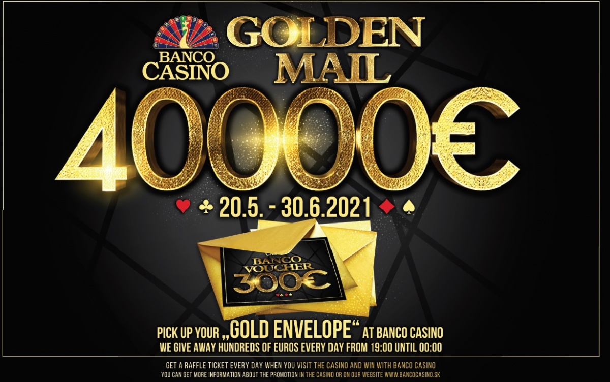 Open a gold envelope every day at Banco Casino and win hundreds of Euros! Every day from 20.5. - 30.6.2021 upon arrival at the casino you will receive a raffle ticket, which will be in the wheel of fortune and between 19:00 and midnight the names of the present lucky guests will be drawn, who can pick up the "Golden Mail" in the total value of up to 40 000€! Hundreds of Euros in "Golden Envelopes" are waiting for lucky winners every day!
