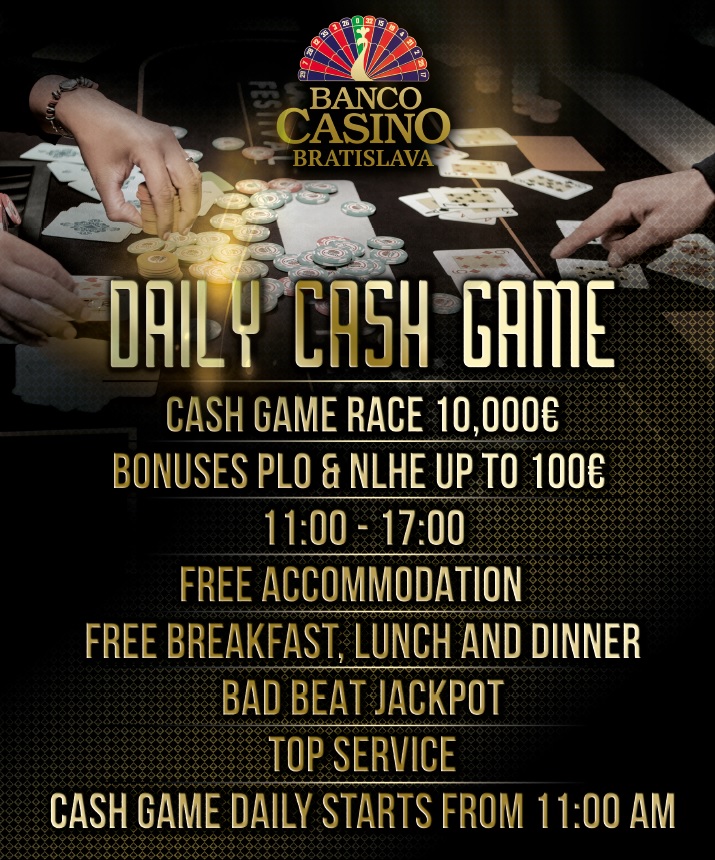 Banco Casino Bratislava will also offer "cash players" a daily cash game starting at 11:00, which will be full of BONUSES. Up to 100€ you will be able to get for an ace fullhouse (and a better combination) by playing from 11:00 - 17:00, free accommodation for 6 or more hours played on cash game, free refreshments and drinks, Cash Game Race 10,000€, Bad Beat Jackpot over 52,000€ - You just play and Banco Casino will take care of everything else!