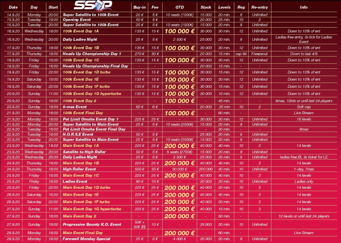 The fifth edition of the Slovak Series Of Poker starts on September 14, bringing everything the heart of a tournament and cash game player desires. All tournament formats such as 6-max, Pot Limit Omaha, Heads Up Championship, big guarantees 100,000€ event, Highroller 30,000€ GTD or Main Event 200,000€ GTD. There is a lot to choose from and it's up to you what you choose!