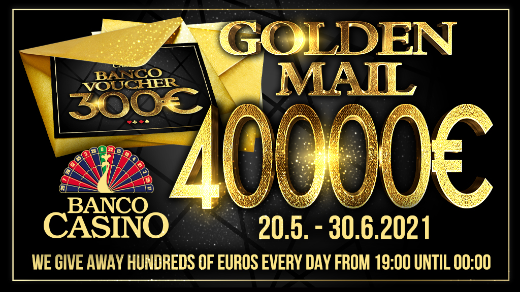 Open a gold envelope every day at Banco Casino and win hundreds of Euros! Every day from 20.5. - 30.6.2021 upon arrival at the casino you will receive a raffle ticket, which will be in the wheel of fortune and between 19:00 and midnight the names of the present lucky guests will be drawn, who can pick up the "Golden Mail" in the total value of up to 40 000€! Hundreds of Euros in "Golden Envelopes" are waiting for lucky winners every day!