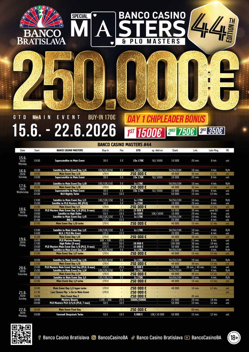 Najznámejší turnaj BANCO CASINO MASTERS a to už 44-krát v poradí a znova prinesie Main Event s garanciou 250.000€ a to len za 170€ vstupné. Banco Bratislava prináša aj Chipleader Bonus a to v každom flighte prví traja na chipoch dostanú brutálny bonus v celkovej hodnote 2.600€!