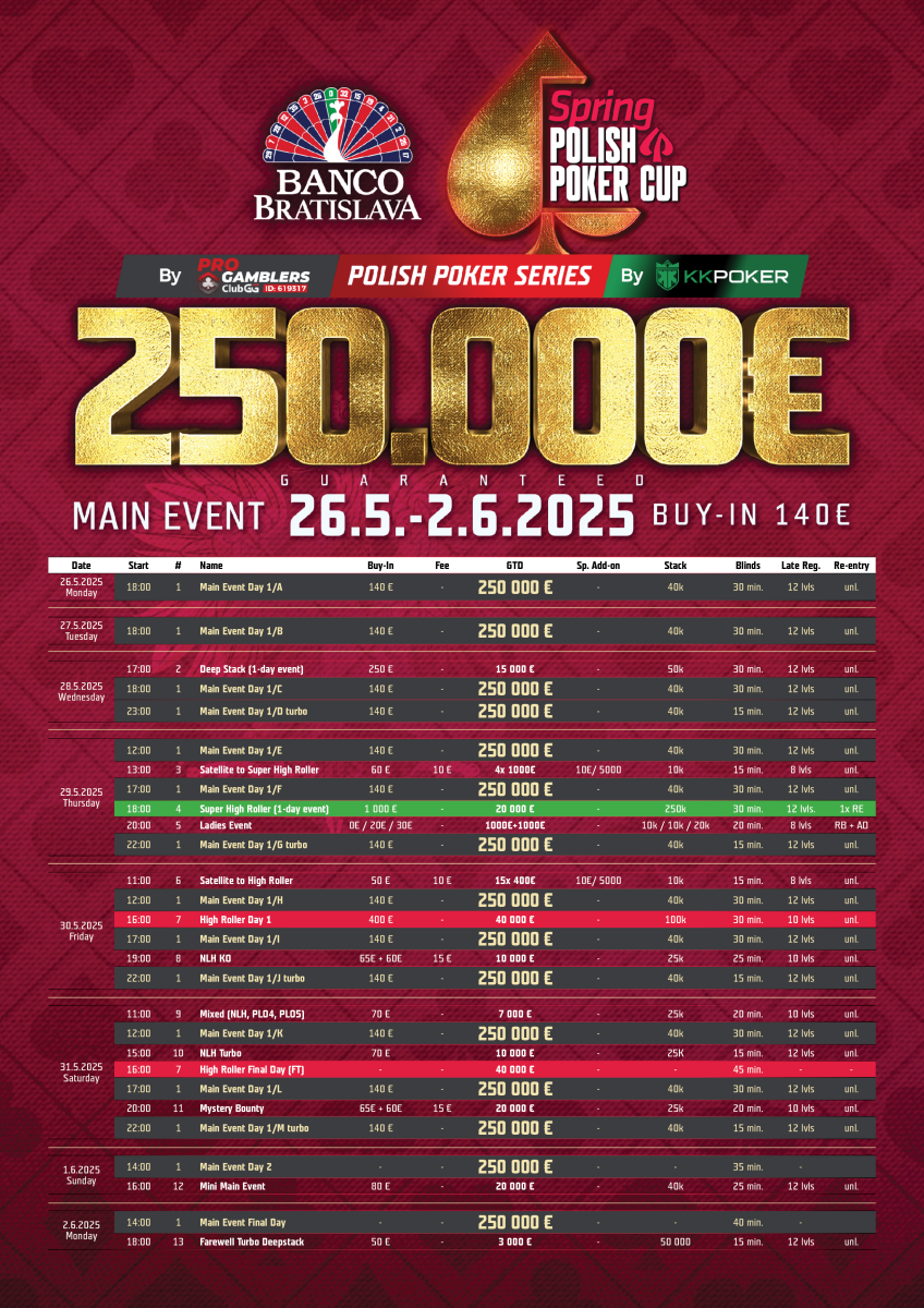 Druhá zastávka Polish Poker Cup roku 2025 v Banco Bratislava odštartovala a to rovno úvodným dňom Main Eventu 250.000€ GTD a to len za 140 eurové vstupné! Chcete vedieť kto postúpil hneď na úvod? Dozviete sa v článku a dnes bude Main Event Spring Polish Poker Cupu pokračovať druhým úvodným dňom od 18:00!