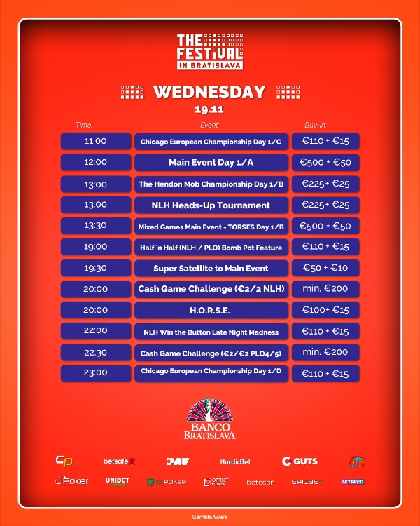The Festival Main Event 500,000€ GTD dnes otvoril svoje brány flightom 1A a do turnaja sa zapojilo celkom 58 hráčov. Miestenku do day 2 si tak vybojovalo sedem z nich a ako chipleader sa so stackom 1,098,000 umiestnil Daniel Koloszar. V týchto chvíľach sa dohráva Headsup event a kto zvíťazí sa dozvieme neskôr. V Hendon Mob Championshipe sa dnes stretlo 114 hráčov a do Final Day postupovalo 14 z nich. Main Event pokračuje flightom 1B od 12:00, Hendon Mob Championship svoj flight 1C otvára o 13:00. O 17:00 na nás čaká PLO High Roller s buyinom 1,100€ a garanciou 25,000€. Samozrejmosťou je aj množstvo menších turnajov a tak sledujte náš web a sociálne siete. Tešíme sa na Vás !