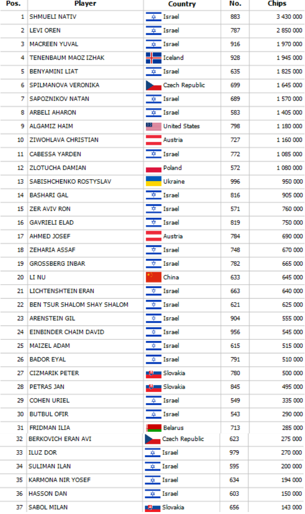 Na flope 7d 5d Js bolo v pote 12,000 a Yuval Macreen betoval 5,000. Roni Bonfil odpovedal all inom za 35,000 a Rafael Davidzon okamžite zaplatil. Macreen rejamoval 101,500 a Davidzon po chvíľke dorovnal s Qd 4d. Macreen držal Kx Kx a Roni 4x 4x. Po blank turne aj rivri si tak Yuval pripisuje riadny pot.
