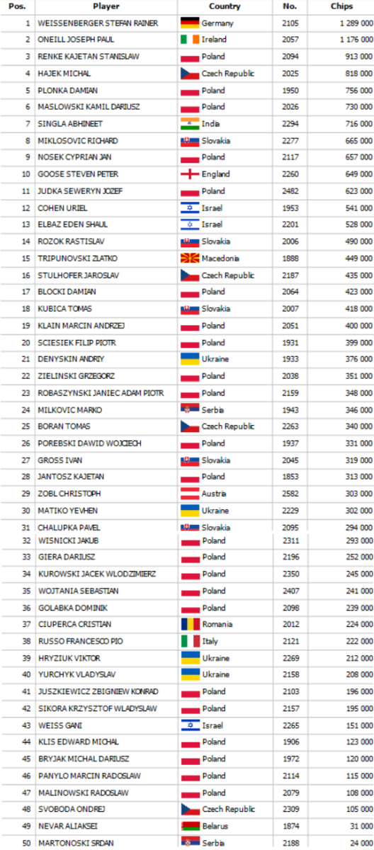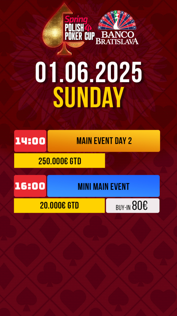 • Do flightu 1K sa zapojilo 499 hráčov. Spoznali sme tak rovných 50 postupujúcich a chipleaderskú pozíciu zaujal Stefan Weissenberger so stackom 1,289,000. Do flightu 1L v týchto chvíľach zasiahlo 407 hráčov a neskorá registrácia je otvorená do 00:30. Flight 1M – Turbo je zároveň poslednou možnosťou ako sa dostať do zajtrajšieho day 2 a bojuje v ňom 67 zo 79 hráčov. Neskorá registrácia bude otvorená do 1:40. Po jej uzavretí sa dozvieme definitívny počet entries. SPPC bude pokračovať od 14:00 svojim day 2 a od 16:00 sa začína SPPC Mini Main Event s garanciou 20,000€ pri buyine 80€. Tešíme sa na Vás !