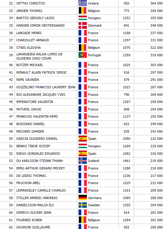 Na rivri 2h Ks 7h 9s 8c bolo v pote 17,000 a Remi Debord sa rozhodol pre push za asi 30,000. Bruno Laurent po nejakom čase dorovnal s Kd Th a súpera so štvorkami porazil.