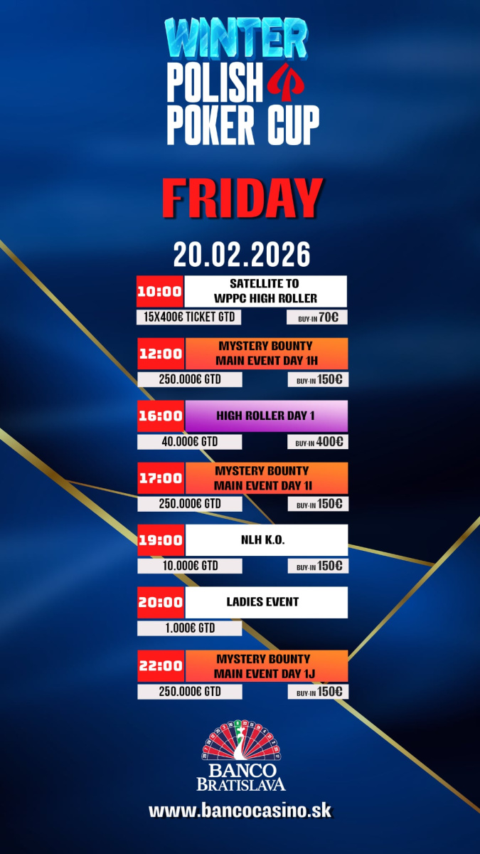 WPPC Main Event 250,000€ GTD má za sebou svoj flight 1E, ktorý prilákal celkom 265 hráčov a spoznali sme tak 27 postupujúcich. Najvyšší stack si dnes odniesol Ryan Johnson a to 755,000. Flight 1F vyprodukoval zatiaľ 373 entries a flight 1G – Turbo 61 entries, no neskorú registráciu majú ešte otvorenú. Zajtrajší rozpis nájdete nižšie. Tešíme sa na Vás !