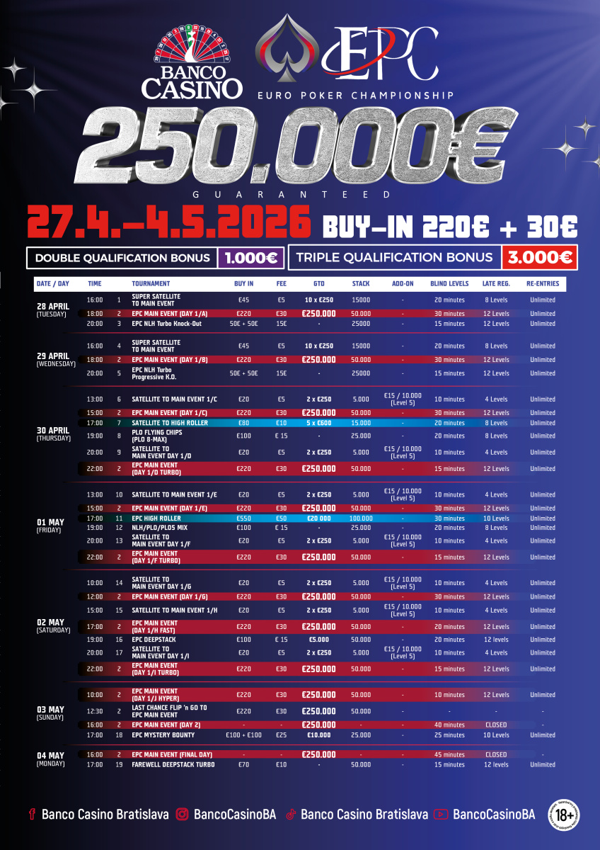 Na Slovak Poker Open plynulo nadviaže ďalší veľký festival – Euro Poker Championship, ktorý sa uskutoční 27. apríla – 4. mája 2026. Aj tu bude hlavným lákadlom Main Event s garanciou 250.000 €, ktorý sa hrá za buy-in 220 € + 30 €. EPC prinesie do Bratislavy hráčov z mnohých krajín a sľubuje týždeň plný kvalitnej turnajovej akcie aj napínavých cash games.
