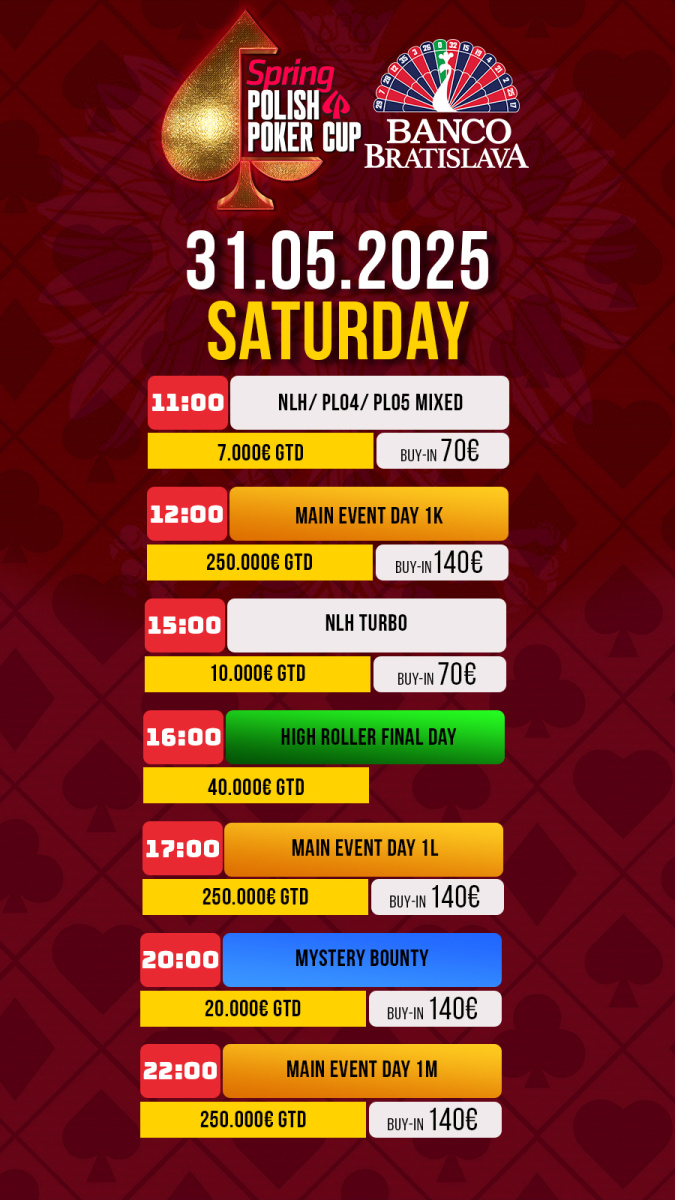 Garancia Main Eventu Polish Poker Cupu tradične neodolala náporu hráčskej komunity Banco Bratislava a aj teraz sa bude hrať o viac ako štvrťmilióna eur. Dnes sú nachystané posledné tri možnosti na postup so štartom od 12:00 ako aj Mystery Bounty 20.000€ GTD spoločne s finálovým dňom úspešného High Rolleru – dnes to bude „full house“ v Banco Bratislava!