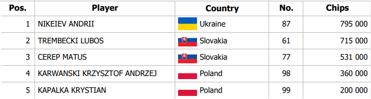 Flight 1/B of tournament Carpathian Poker Series recorded 52 entries and 5 players advanced to the Final Day. Chipleader from this flight is Nikeiev Andrii alias "Hustler" with stack of 795,000.