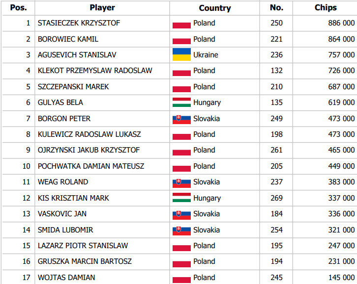 All started with Kosla, who shoved from UTG with his short approx. 100K. Nowinski joined and re-shoved with a similar stack, and Stasieczek, who covered them both, called. In a 3-way all-in, Stasieczek was the underdog with 73s, and needed a lucky board to wrap up this flight. He indeed hit the 7 right on the flop, and after the river, Kosla and Nowinski were eliminated. After this game, the 17-man advancing squad was resolved!