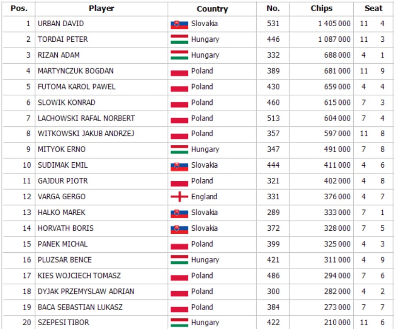 The fourth Flight 1/D of the Carpathian Poker Series is over and Banco Casino Kosice recorded 214 entries with 21 advancing players to the Final Day. Chipleader from this flight is Urban David with stack of 1,405,000.