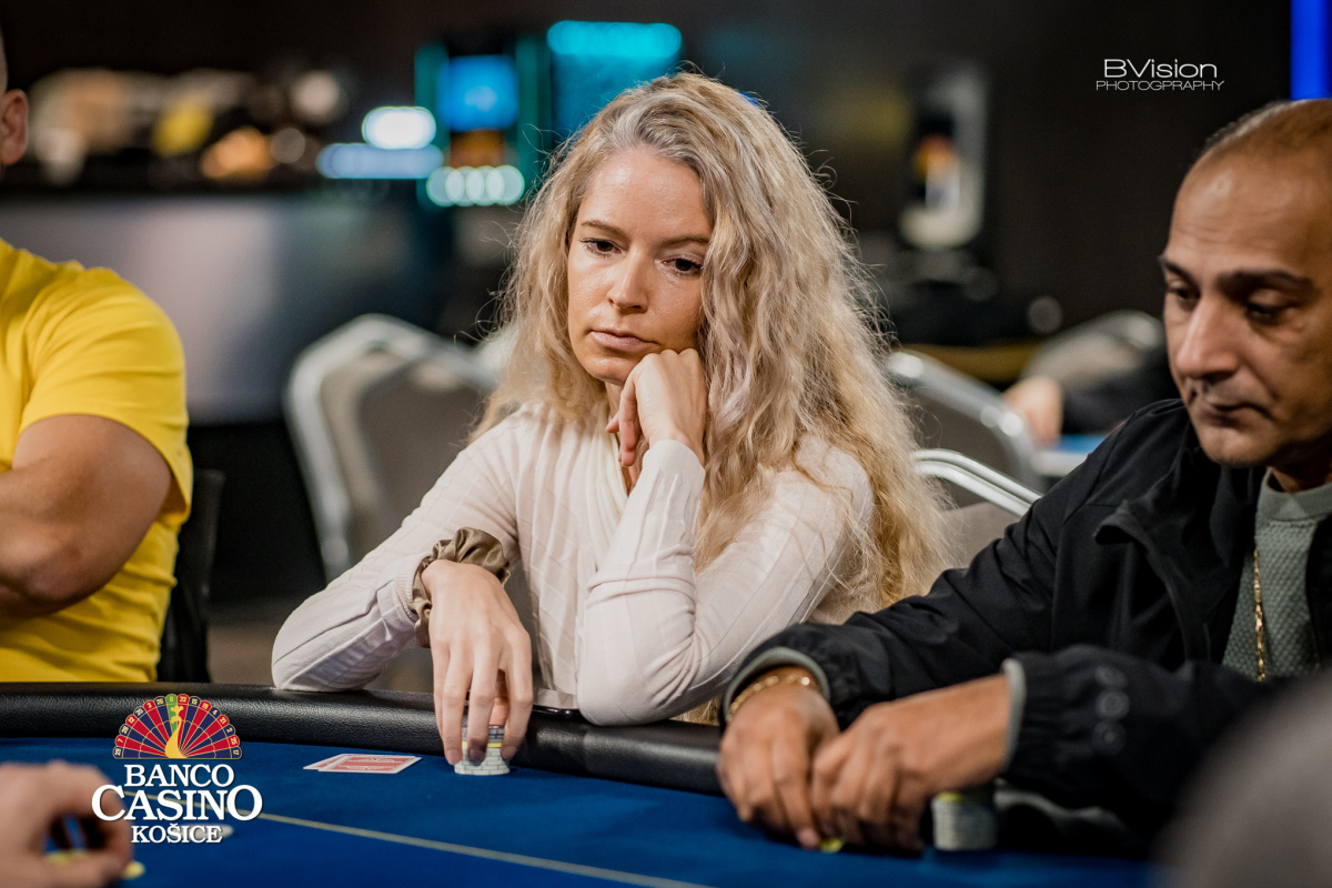 Three players, Eliášová, Rubi and Zagiba were in the game on the flop Q♦ 7♠ 2♦. Two of them, Eliášová and Zagiba ended up in all in for Eliášová´s 55,7k stack. In showdown Eliášová holds K♦ Q♣, but needs to improve against AA under Zagiba´s hand. Turn 7♦ brings flushdraw for Eliášová, who doubles up after fourth ♦ on the river.