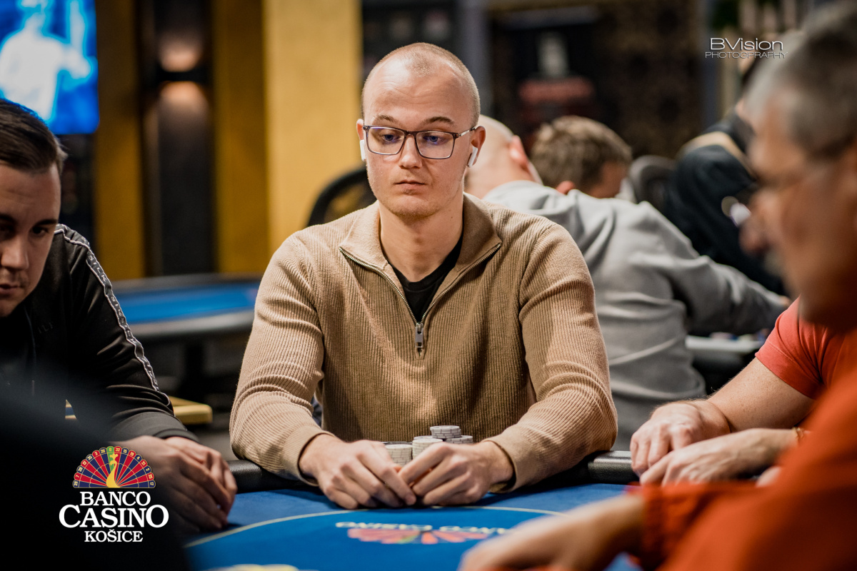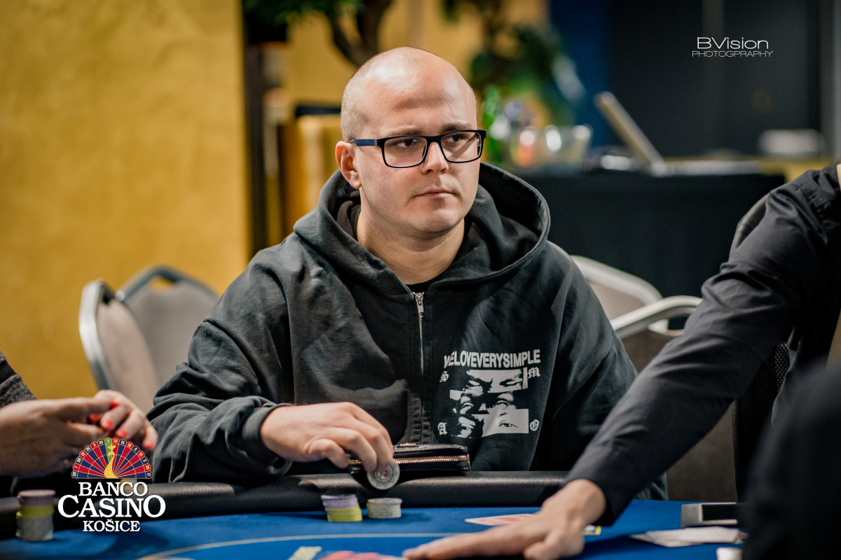 Vaškovič ended up in preflop all in for 21,9k with KQo and his opponent was Mihalo, who holds AKo. Flop A-Q-3 brings hit for both players, turn K changes nothing, but river Q means double up for Vaškovič.