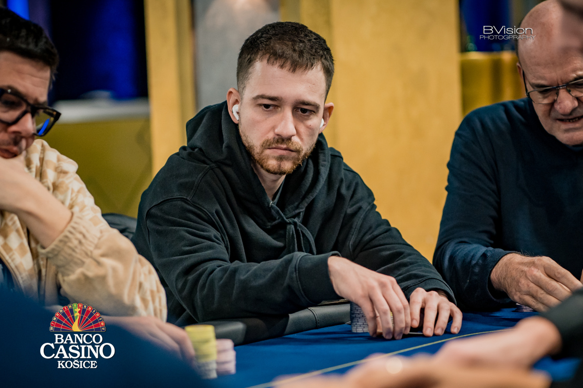 After minraise and 2x call, Eros from BB 3bets to 40k that called Durra and Gajdoš IP. Flop T♦ 8♣ 5♣ cbets Eros 55k, Durra moves all in 124k, Gajdoš with 110k pays and also Eros, who covered both players. In showdown holds Eros A♦ K♦, Durra 8♥ 9♥ and Gajdoš shows set of eights. Turn 2♦ brings flushdraw for Eros, but river 3♥ triples Gajdoš´s stack.