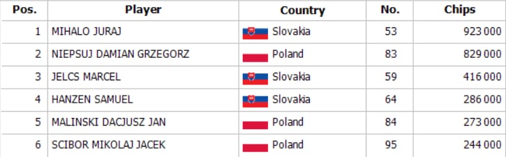 In the last game before the final table was formed, Jelcs met with Frenchko on the flop A-K-T, where Frenchko led 10K and got called. The same action for 20K on the turn T, and after the third T arrived on the river, Frenchko decided to shove his 118K stack. Jelcs took a minute to think, but he eventually called with A4s. He caught a bluff by Frenchko with J6o, after which he was eliminated.
