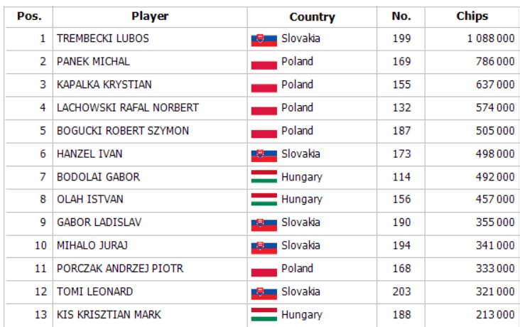 Flight 1C of the tournament, Fifty Grand recorded 132 entries, and 13 players advanced to the Final Day. Chipleader from this flight is Trembecki Lubos with a stack of 1,088,000.
