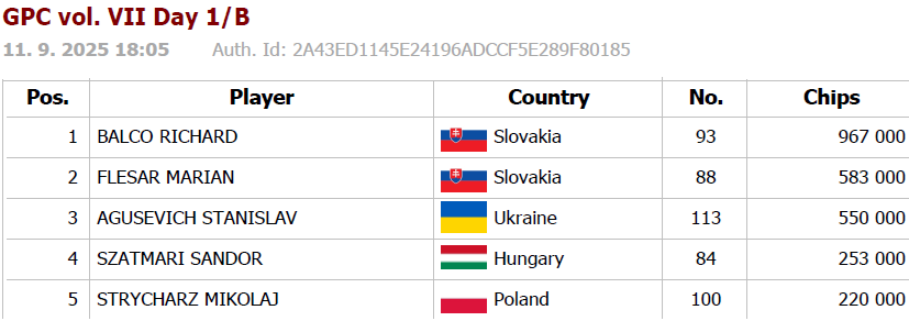 Flight 1B of the tournament GRAND POKER CUP vol. VII recorded 51 entries, and 5 players advanced to the Final Day. The chipleader from this flight is Balco Richard with a stack of 967,000.