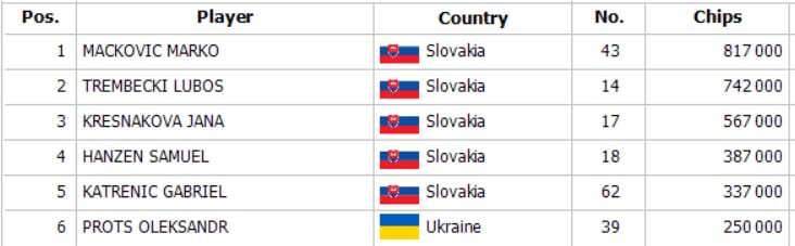 After minraise from Niepsuj and two callers, Martincek on the SB decided to 3-bet to 88K, only to face a 4-bet shove for 184K by Katrencak. After other players folded, Martincek eventually jammed his 181K stack with pocket 88. He stood against Katrencak with pocket TT, and needed to hit his two outer to survive. It did not happen and Katrencak eliminated him from this flight.