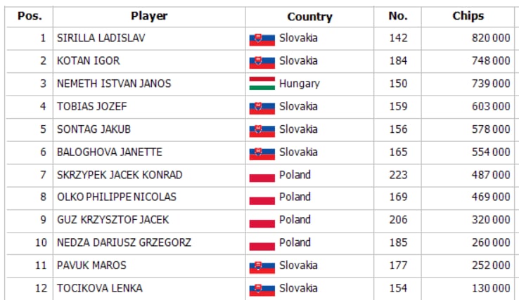 Flight 1/C of the tournament GRAND POKER CUP vol. VIII recorded 119 entries, and 12 players advanced to the Final Day. The chipleader of this flight is Sirilla Ladislav with a stack of 820,000.