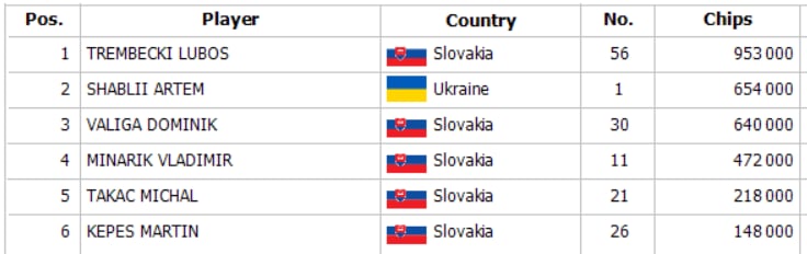 In the last hand of this flight, Bujnak limped, Minarik raised to 35K, and Takac, together with Bujnak, called. The flop came K♥9♣8♦, and Takac led for 25K, followed by a shove from Bujnak, and a re-shove by Minarik with his 140K stack, to which Takac responded with a squeeze as well. In the showdown, Minarik showed pocket AA against AKo under Bujnak´s hands, and K6s under Takac´s. After the runout, Bujnak was eliminated, and Minarik scooped a huge pot for himself. After this game, we have the six advancing players from this flight to the Final Day.