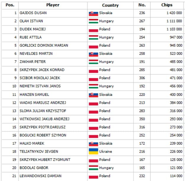 Flight 1C of Master of Disaster vol. IV recorded 213 entries, and 21 players advanced to the Final Day. Chipleader from this flight is Gajdos Dusan with a stack of 1,420,000.