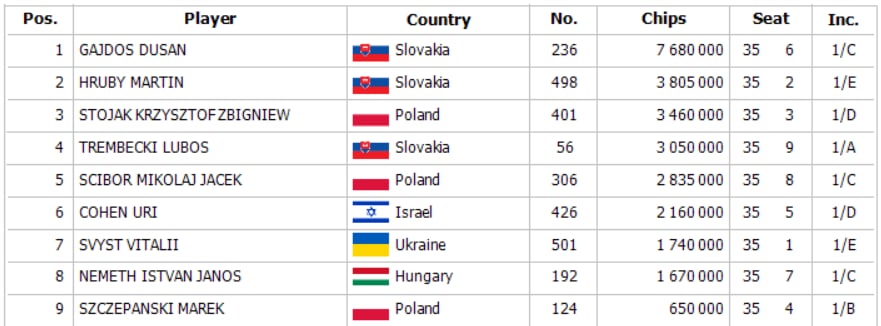 He stacked with the chipleader Szczepanski pre-flop after he found pocket JJ and Szczepanski KK. After a Q-high board, Gajdos ended in 5th position.