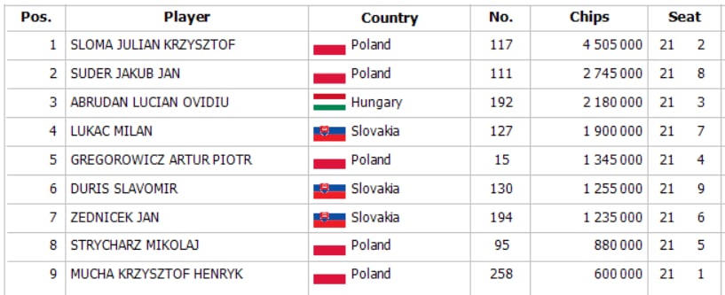 Jurczak posiela svoj short do hry a Abrudan na BB calluje, Jurczak drží Ac 5c a Abrudan 8c 9c, flop A-T-T je bezpečný pre Jurczaka, ale turn 7 prináša open pre Abrudana, ktorý completuje striaght na river 6 a tak Jurczak končí pred bránami peňazí.