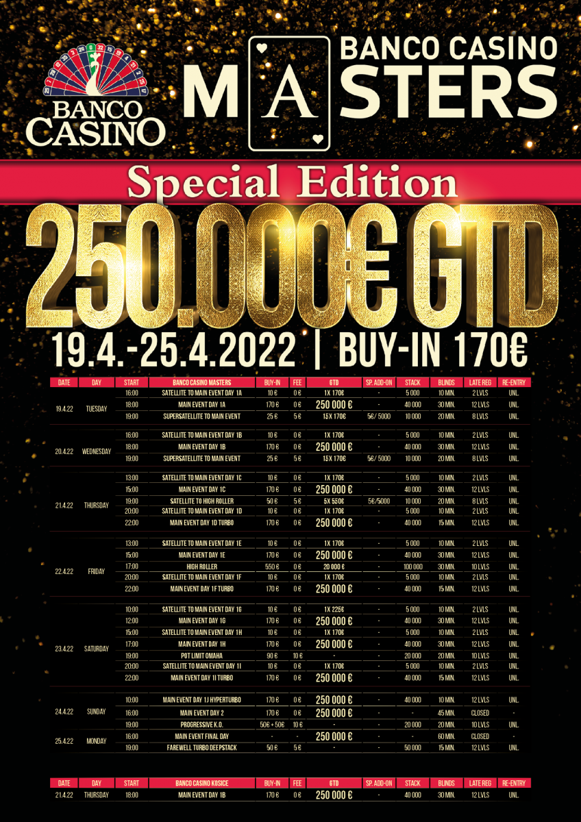 Najväčší pravidelný pokrový turnaj na Slovensku BANCO CASINO MASTERS prinesie pokrovým hosťom špeciálne vydanie, v ktorom bude kasíno garantovať 250.000€. Tradičný buy-in 170€ zostane nezmenený, no prizepool Main Eventu narastie do závratných výšin. Aprílová edícia Masters bude mať prívlastok špeciálna, keďže na pokrových účastníkov bude čakať aj Highroller s garanciou 20.000€, parádne side eventy a atraktívnu cash game akciu plnú bonusov!