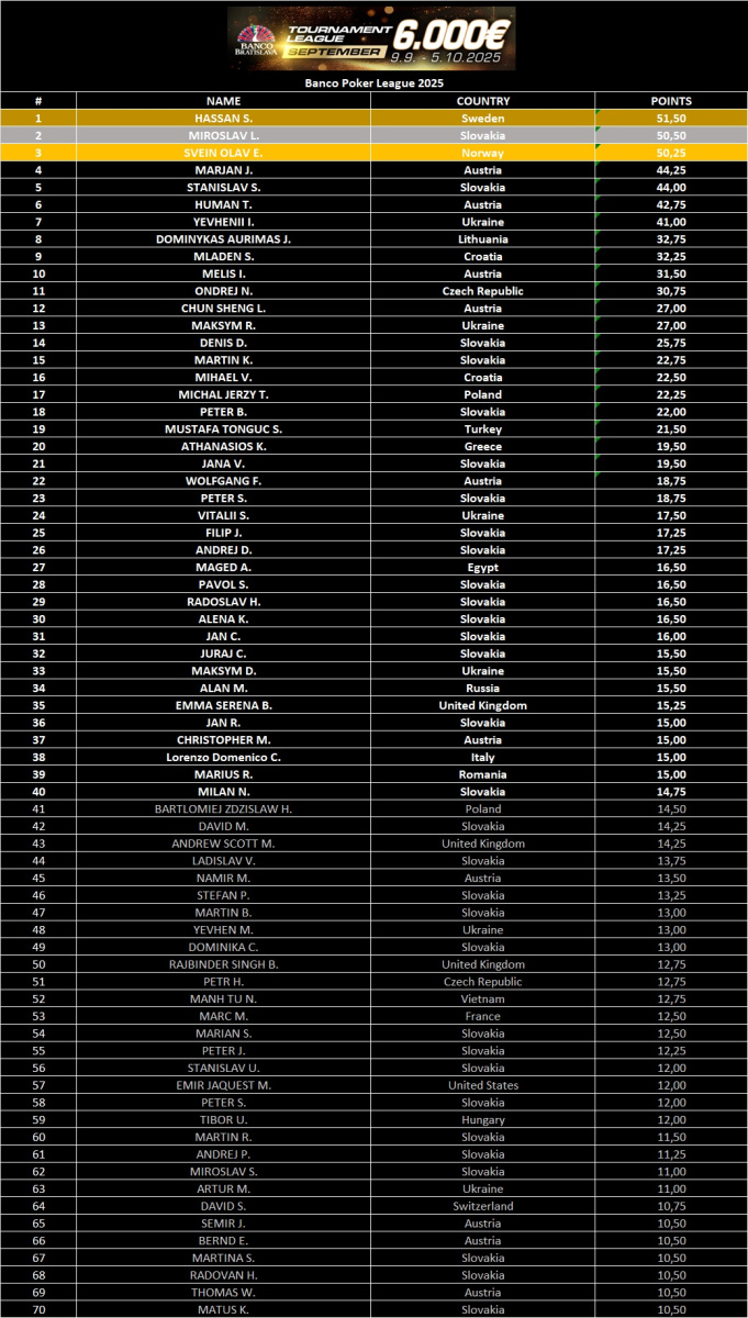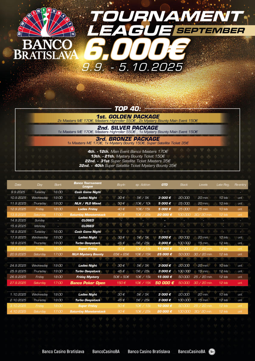 Od 9. septembra do 5. októbra 2025 sa Banco Casino Bratislava stane dejiskom exkluzívnej pokrovej turnajovej ligy, kde sa každý turnaj počíta a každý bod môže rozhodnúť. Hráči budú počas piatich týždňov zbierať body za svoje výkony, a tí najúspešnejší si odnesú hodnotné ceny.