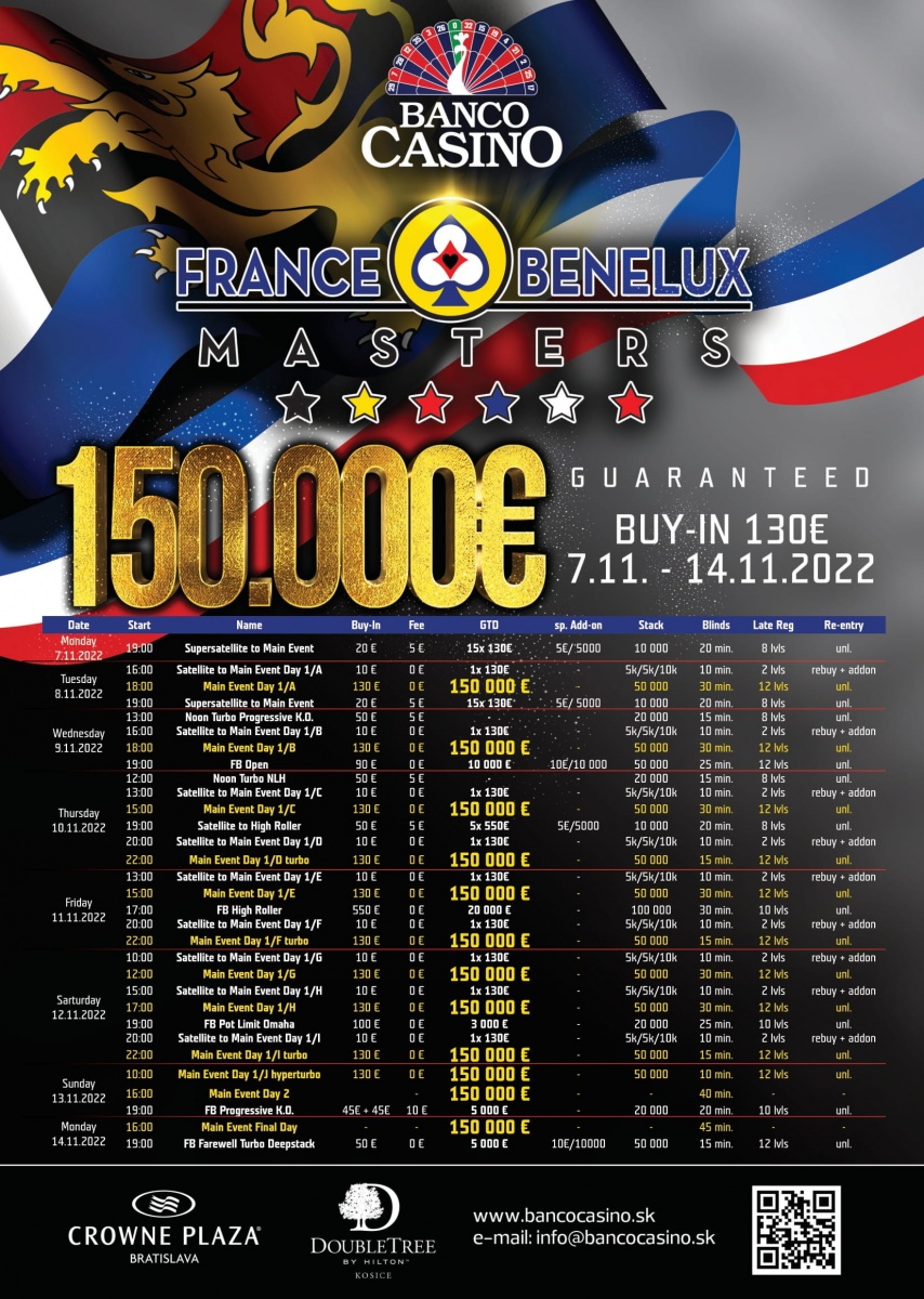 Banco Casino hlási ďalšiu mega pokrovú akciu s názvom France – Benelux Masters, ktorý prinesie parádny Main Event, spoločne s atraktívnymi side eventmi a ešte lepšou cash game akciou začiatkom novembra – 7.11. - 14.11.2022. Do Banco Casino prídu hráči z Francúzska, Belgicka, Holandska, Luxemburska a samozrejme aj ostatných krajín sveta, aby si zahrali o druhé tituly šampióna France – Benelux Masters v niekoľkých disciplínach.