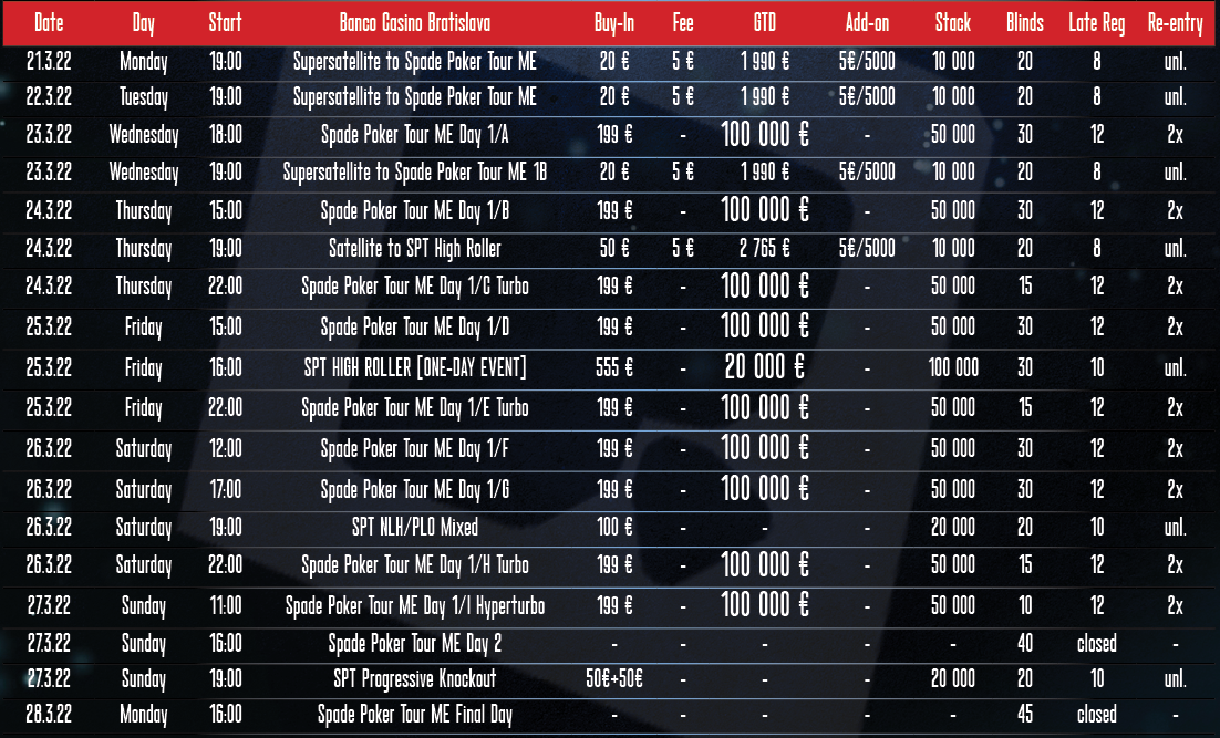 Priatelia pokru, v spolupráci so Spade Poker TV sme si pre vás pripravili pokrovú lahôdku a v dátume od 21. do 28. marca sa môžete tešiť na festival Spade Poker Tour RAISE YOUR SKILL, ktorý prinesie omnoho viac, ako len pokrový turnaj!
