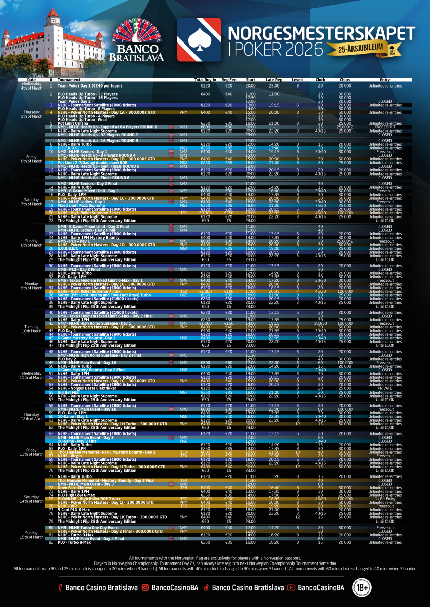 Marec odštartujú Nórske Majstrovstvá s poradovým číslom 25, keďže po minuloročnom obrovskom úspechu prichádzajú Nóri späť – tentokrát ešte vo väčšom štýle. Očakáva sa masívna účasť nórskych hráčov, pre ktorých je toto podujatie srdcovou záležitosťou a jedným z najväčších národných pokrových sviatkov v Európe. Jubilejný ročník pritiahne stovky nadšených hráčov, ktorí dokážu rozohrať akciu pri každom stole. Na programe bude aj otvorený Main Event Poker North Masters, ktorý bude garantovať 300.000€ za vstupné 400€!
