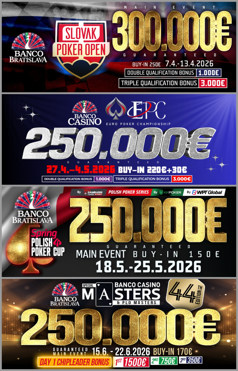 Pokerovú jar uzavrie a zároveň odštartuje leto jeden z najikonickejších turnajov v Banco – Banco Casino Masters, ktorý sa hrá s garanciou 250.000 € pri buy-ine len 170 €. Tento event si za roky vybudoval reputáciu jedného z najpopulárnejších turnajov v strednej Európe a každoročne priťahuje obrovské pole hráčov aj skvelú atmosféru pri pokrových stoloch. Kto bude 44. šampiónom?