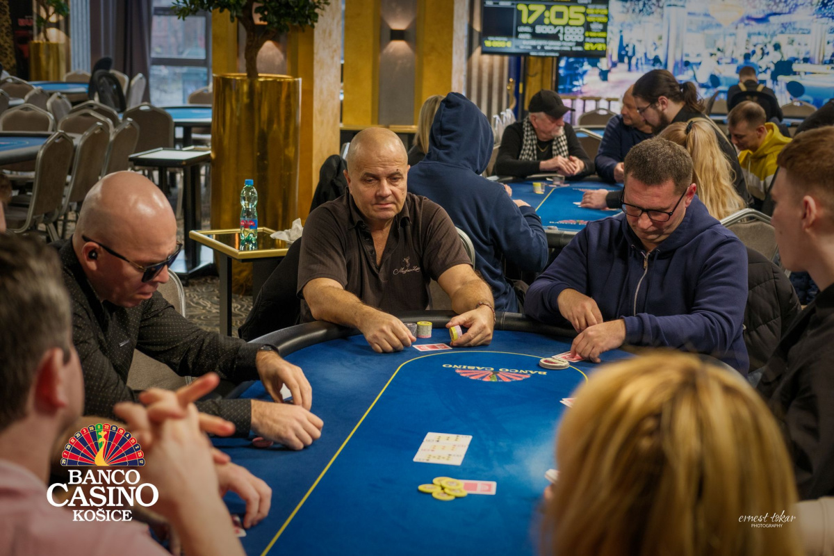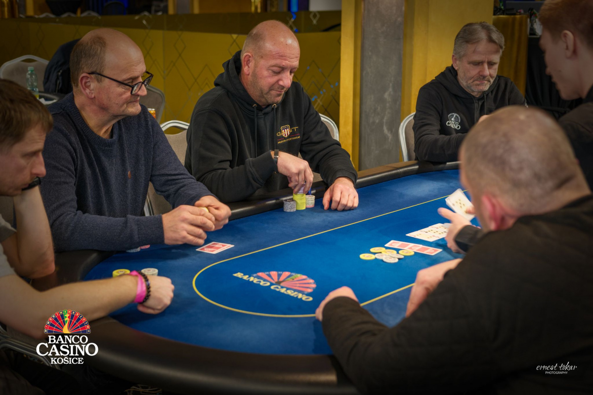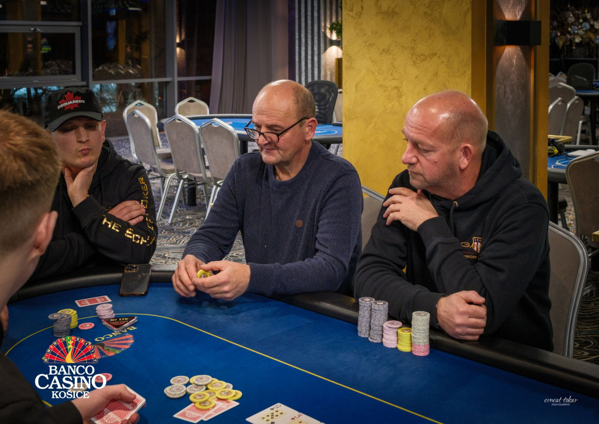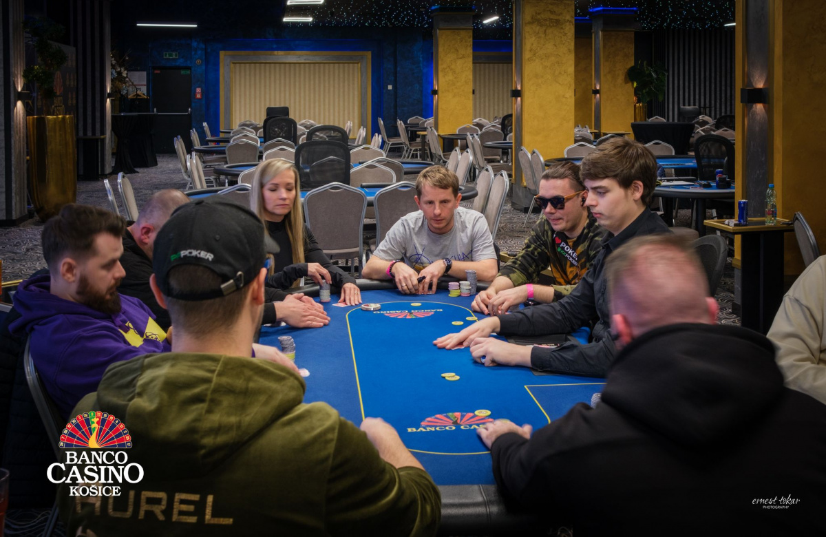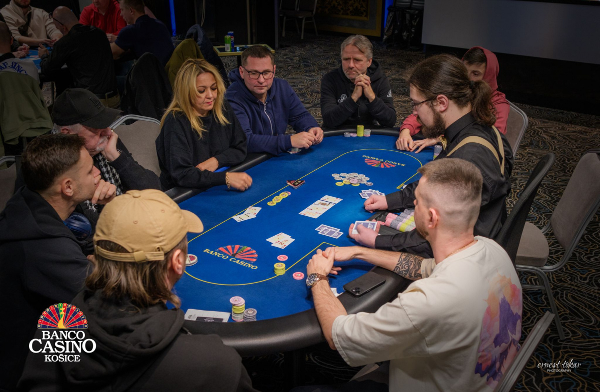 V hre sa ocitli piati hráči na flope 7♦ 4♥ 3♦. Ilona vsádza 7k, Meszáros raisuje na 30k a Pošivák z BTN posiela za čiaru 120k stack. Derda z BB calluje so stackom 110k, na čo Ilona aj Meszaros karty zahadzujú. Pošivák otáča 99, no Derda drží 77. Po urn A♣ a rivri 2♥ Derda oslavuje double up.