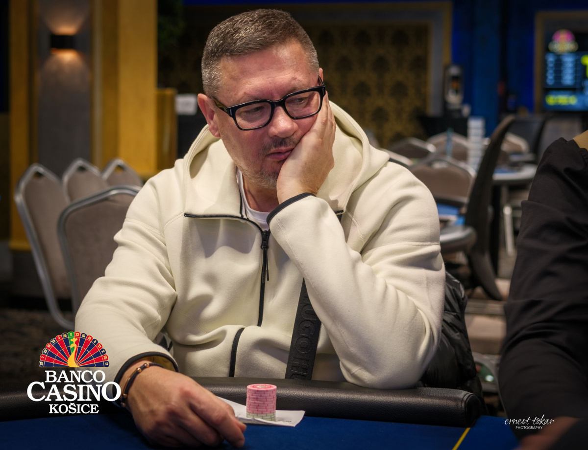 Kazmiruk dostal do hry svoj 54,5k stack preflop s K♠ 9♠, Meszaros so 45,5k stackom drží KJo a Pošivák, ktorý oboch pokrýval otáča ATo. Avšak flop prináša K, ktorý posiela do vedenia Meszarosa, ktorý po blank runoute tripluje a Kazmirukovi ostáva 18k stack.