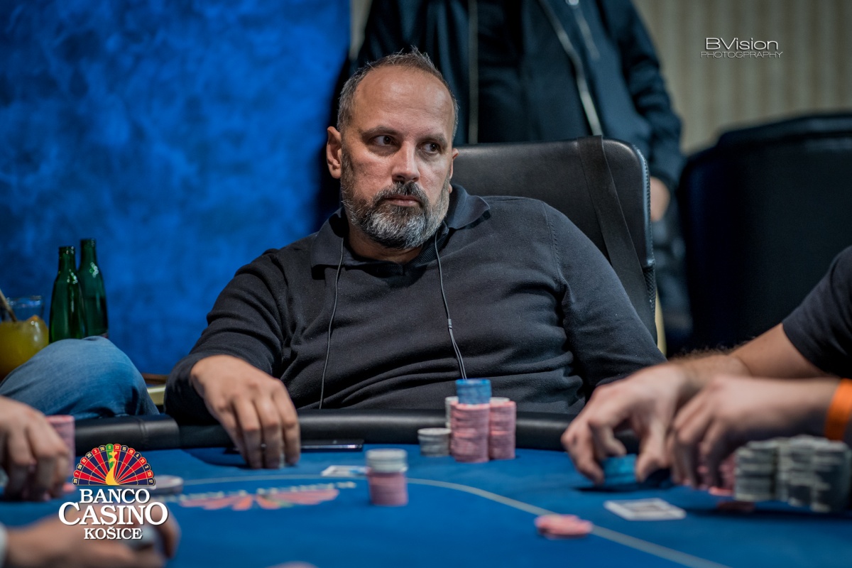 Za 1,750,000 sa dostal do all inu s A♠ K♥ proti Kosárovi s K♣ J♥. Board zápletku nepriniesol a Targoš doubluje svoj stack.