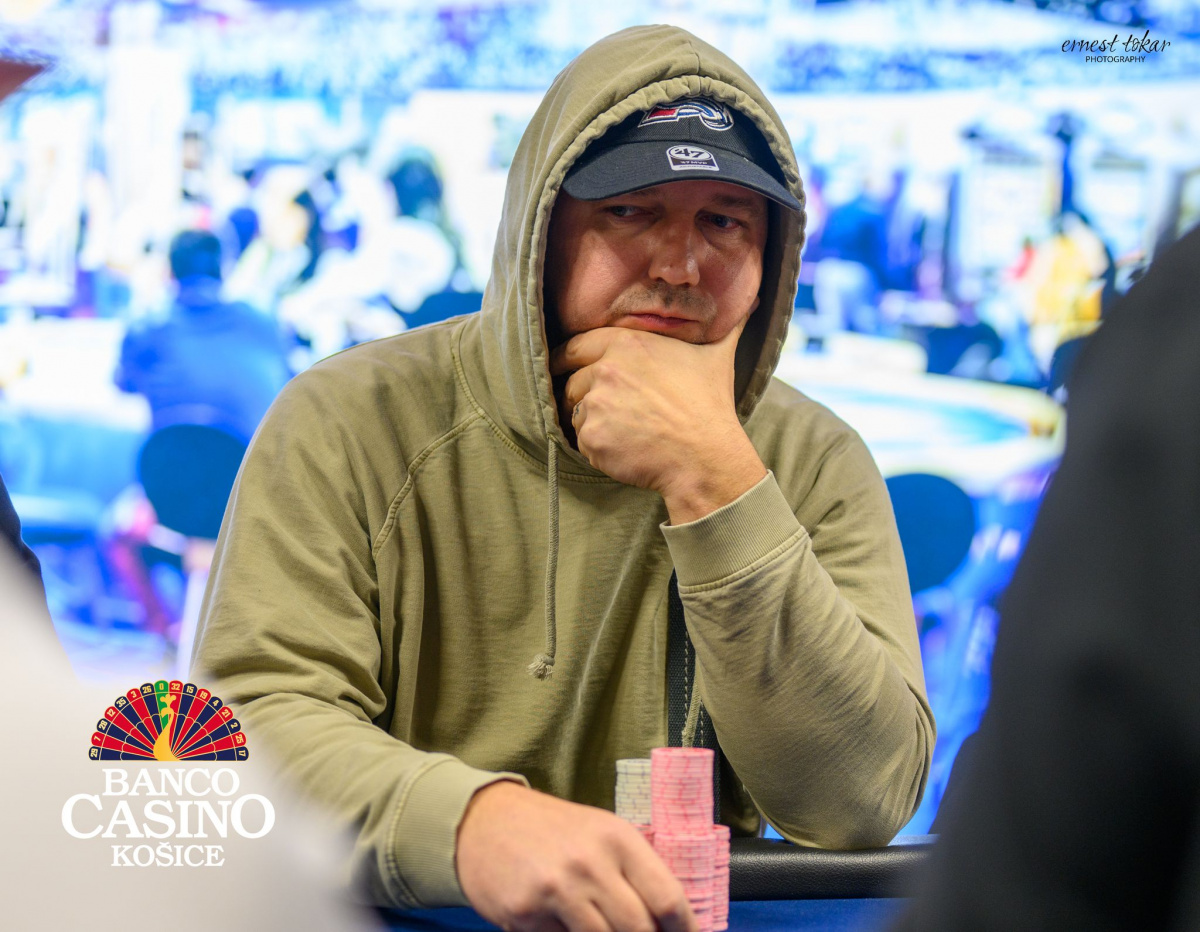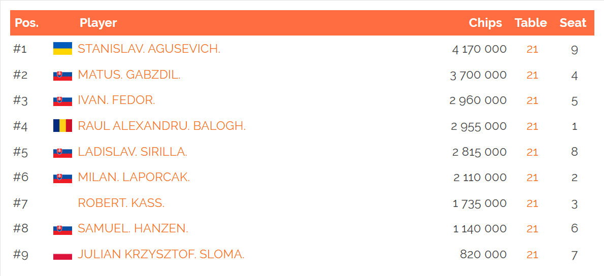 Sloma minraisuje a Kass bráni BB. Flop A♠ Q♣ 4♠ cbetuje Sloma 225k, čo Kass platí. Turn 7♥ pokračoval Sloma 600k, na čo Kass check raisuje na 1,5m. Sloma po chvíli hlási all in 3,3m a Kass so stackom 3,6m snapuje a otáča Q7o. Sloma drží AKo a po 2♣ na river končí.