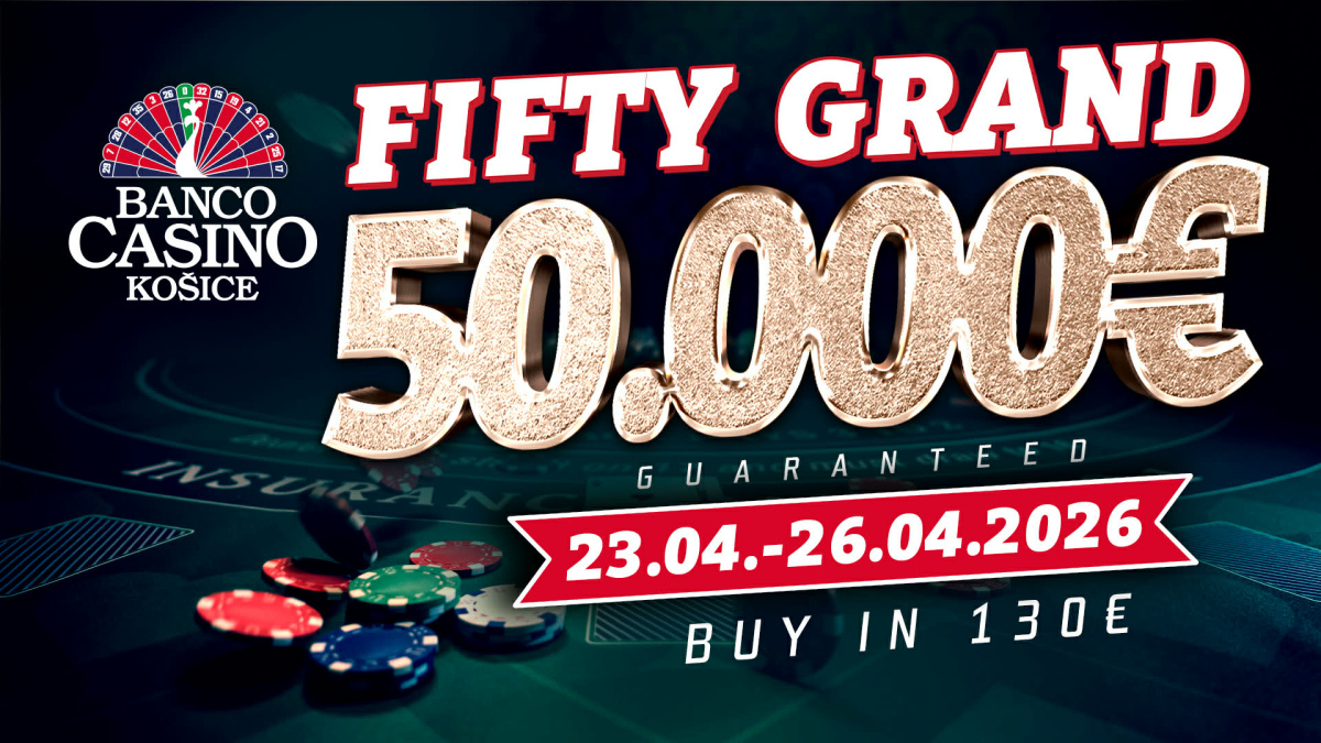 Už tento mesiac! Príďte do Banco Casino Košice na turnaj Fifty Grand s garanciou 50.000 €, ktorý sa uskutoční od 23. do 26. apríla 2026. Zabezpečte si miesto za buy-in 130 € a zabojujte o podiel z 50.000€ garancie.