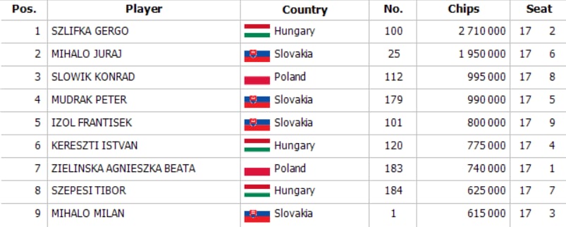 Zielinska zvolila open-shove s KQo a k nej sa pridal Kereszti, ktorý squeezeol svoj 805K stack s párom 66, a Juraj Mihalo reshoveol s KJo a 2,9M stackom. Pár 6 nakoniec dominoval svojich súperov aj po rivri a Kereszti si tak zapísal triple-up a eliminoval Zielinskú z turnaja na 8. mieste.