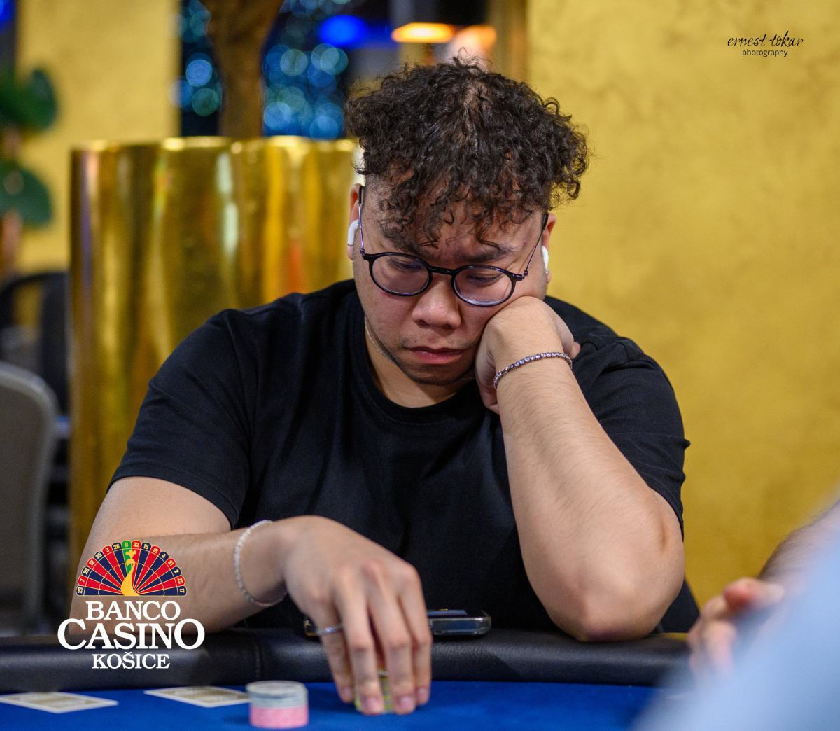 Po 1K opene od Borzaka z UTG calluje Martinček, a Dyjak následne 3-betuje na 4.5K, čo platí Tamaškovič na SB a rovnako tak aj Borzak. Na flope J-6-2 potom Tamaškovič lead-shoveuje svoj short stack s párom 55 a platí len Dyjak, ktorý skrýval QQ. Tamaškovič tak potrebuje pomoc, ktorá na runoute neprichádza, hoci mu na turne pribudli outy s gutshotom. Po blank riveri tak na turnaji končí.