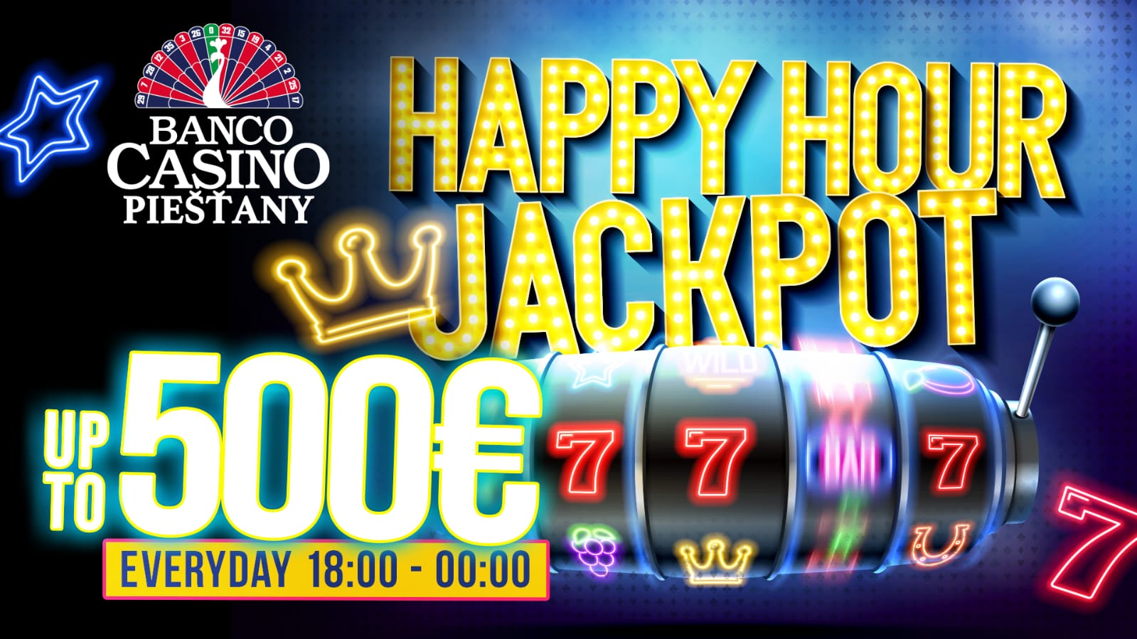 A novelty that has never been here before - Happy Hour Jackpots in Banco Casino will give away tens of thousands of euros! Every day, Banco Casino Piešťany gives out Happy Hour Jackpots of up to €500 to lucky guests. Win extreme Jackpots today! Banco Casino will give out thousands of euros to the guests present every day, as it has prepared HAPPY HOUR JACKPOTS for every day. How to win the Happy Hour Jackpot? Just play the slot machines at Banco Casino Piešťany and luck can smile at you at any time!