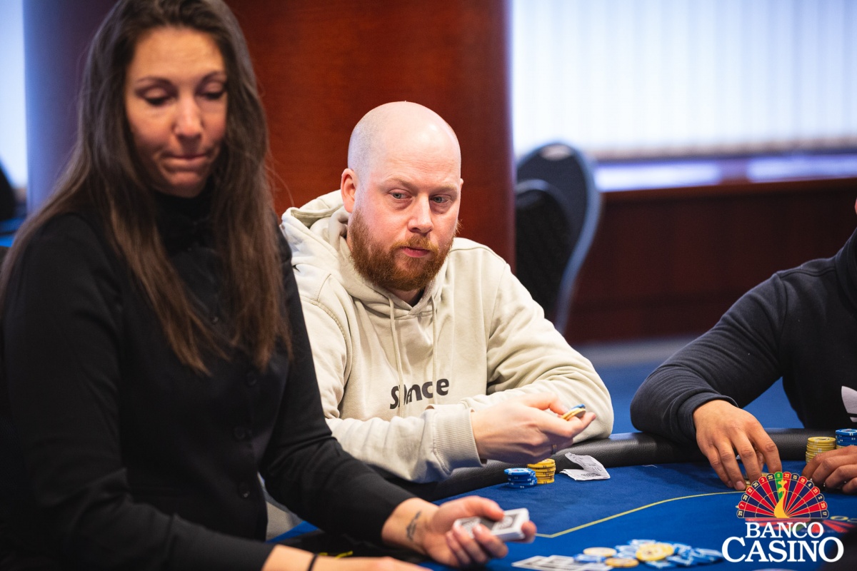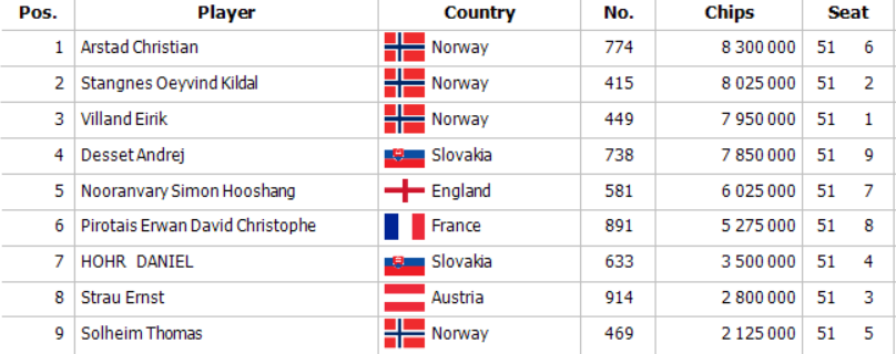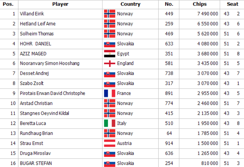 Začiatok finálového stola je veľmi pomalý a na nejakú silnejšiu akciu si počkáme. V poslednej hre Eirik Villand otváral na 325,000 a Simon dorovnal z bb. Na flope Ad 7d Th Eirik c-betol za 325,000 a dostal zaplatené. Na turne Jh Eirik pokračoval za 450,000, ale Simon sa rozhodol pre raise na 1,000,000 a Eirik sa kariet rýchlo zbavil.
