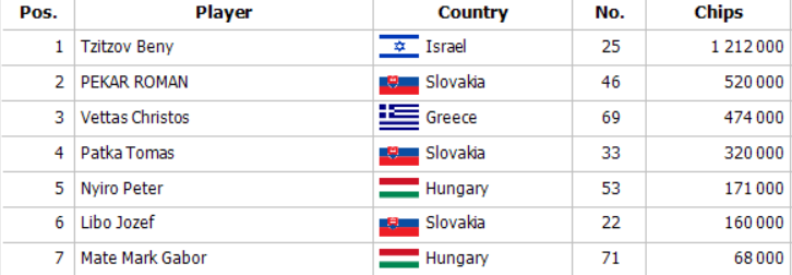 Jozef otvoril z buttonu na 15,000, Nyiro zo sb dorovnal. Na flope 3c 4s Ad Libo betoval 15,000 a jeho súper okamžite karty zahodil. Hru na to z turnaja vypadol Andreas Koreimann, ktorý svoj short prehral s Ax 6x proti Jx 6x u Marka.