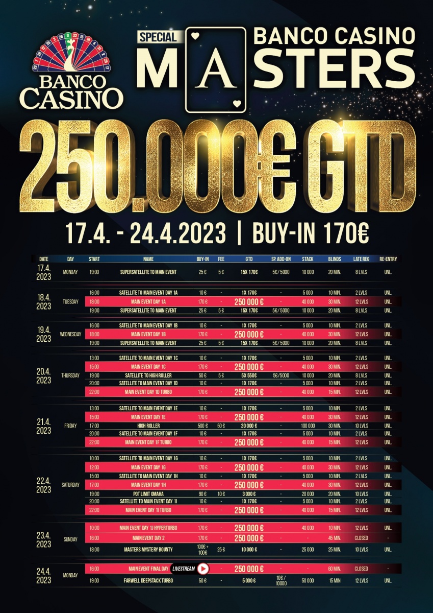 Kompletný rozpis Banco Casino Masters 250,000€ GTD: