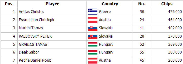 Christos evidentne chytil druhý dych a z posledných 27,000 už pred ním stojí celkom pekná kopa, ktorá istotne atakuje hranicu 300,000. V poslednej hre na turne Kd Td Ah 9s betoval Nadot 56,000 a Grábics premýšľal. Nakoniec dorovnal a pridal sa aj Christos. RIver 6s už všetci traja checkovali. Christos otočil Kx Tx, Nadot s nešťastným výrazom muckol a Grábics face up zahadzoval Ad Jd.