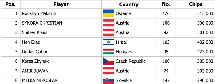 Rišo nieco postrácal a v poslednej hre Spitzer otváral z Ep na 6,000, Kováč poslal jeho 38,700 z buttonu a Erez dorovnal z bb. Spitzer zahodil a Kováč otáčal Qx Qx, kým Erez držal iba desiatky. Board 2x Jx 8x 5x 7x podržal Riša a vyniesol mu pekný double up.