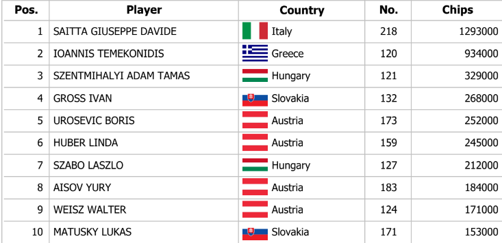 Do flightu 1C zasiahlo celkom 101 hráčov a spoznali sme desať postupujúcich, ktorí sa stretnú v nedeľnom day 2. Najlepší stack vo výške 1,293,000 dnes pozbieral Giuseppe Saitta. Overlay v týchto chvíľach činí masívnych 212,000€ a zajtra je pre Vás pripravená dvojica flightov. 1E od 15:00 a flight 1F – Turbo od 22:00. O 17:00 odštartuje jednodňový highroller s buy inom 550€ a garanciou 50,000€. Tešíme sa na Vás !