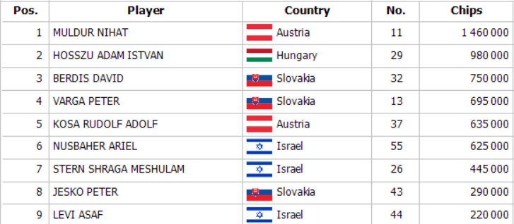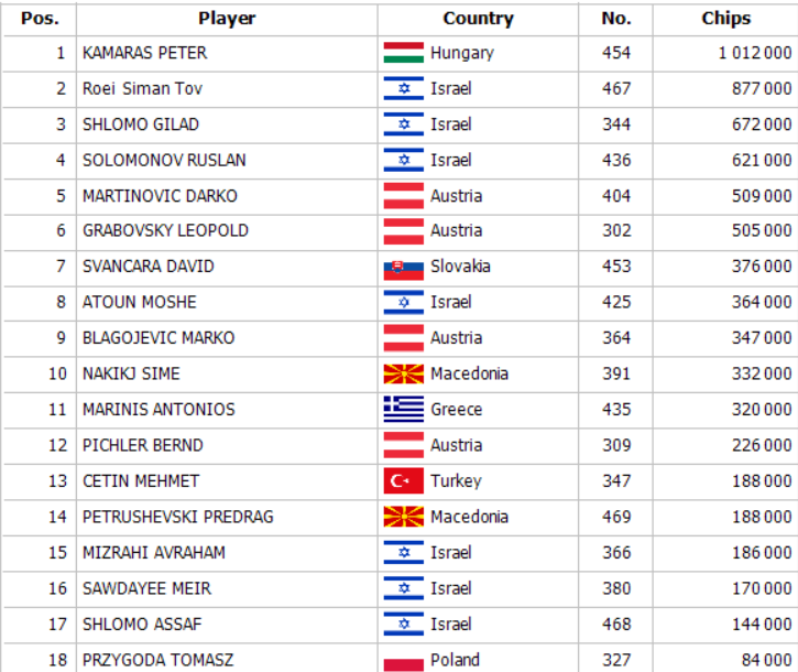 Shlomo otvára na 27,000 a Mizrahi za ním posiela all all in 124,000. Shlomo však zahadzuje. V krátkom slede z turnaja vypadol Zafran, Antala, Darrigo a nás tak čoskoro čaká hand for hand.