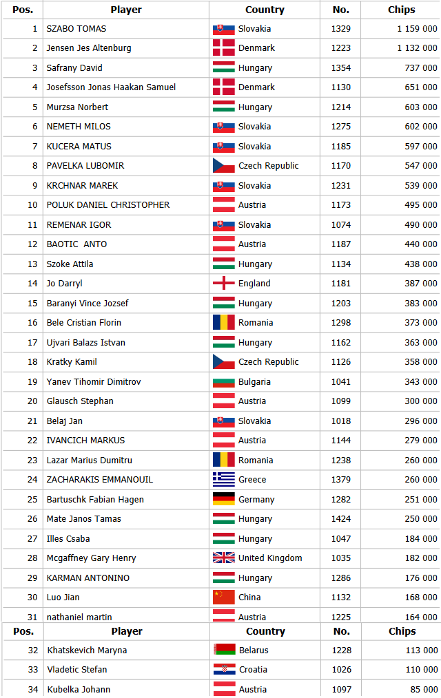 V prvej all in a call situacií posielal Niklas Kiebel all in 143,000 z buttonu a Balasz Ujvari si na bb našiel esá. Po blank boarde prichádzame o prvého z dvoch hráčov. Na vedľajšom stole si all ni za 152,000 strihol Lajo s Ax Qx proti Martinovi Nathanielovi, ktorý tiež držal Ax Qx a board žiadnu drámu nepriniesol, hra dopadla splitom. V treťej hre Miroslav Druga poslal posledných 89,000 s Qh Th a Capo na druhom konci stola našiel Kx Qx. Board 5x 6x 6x Kx Jx tak ukončil flight 1G.